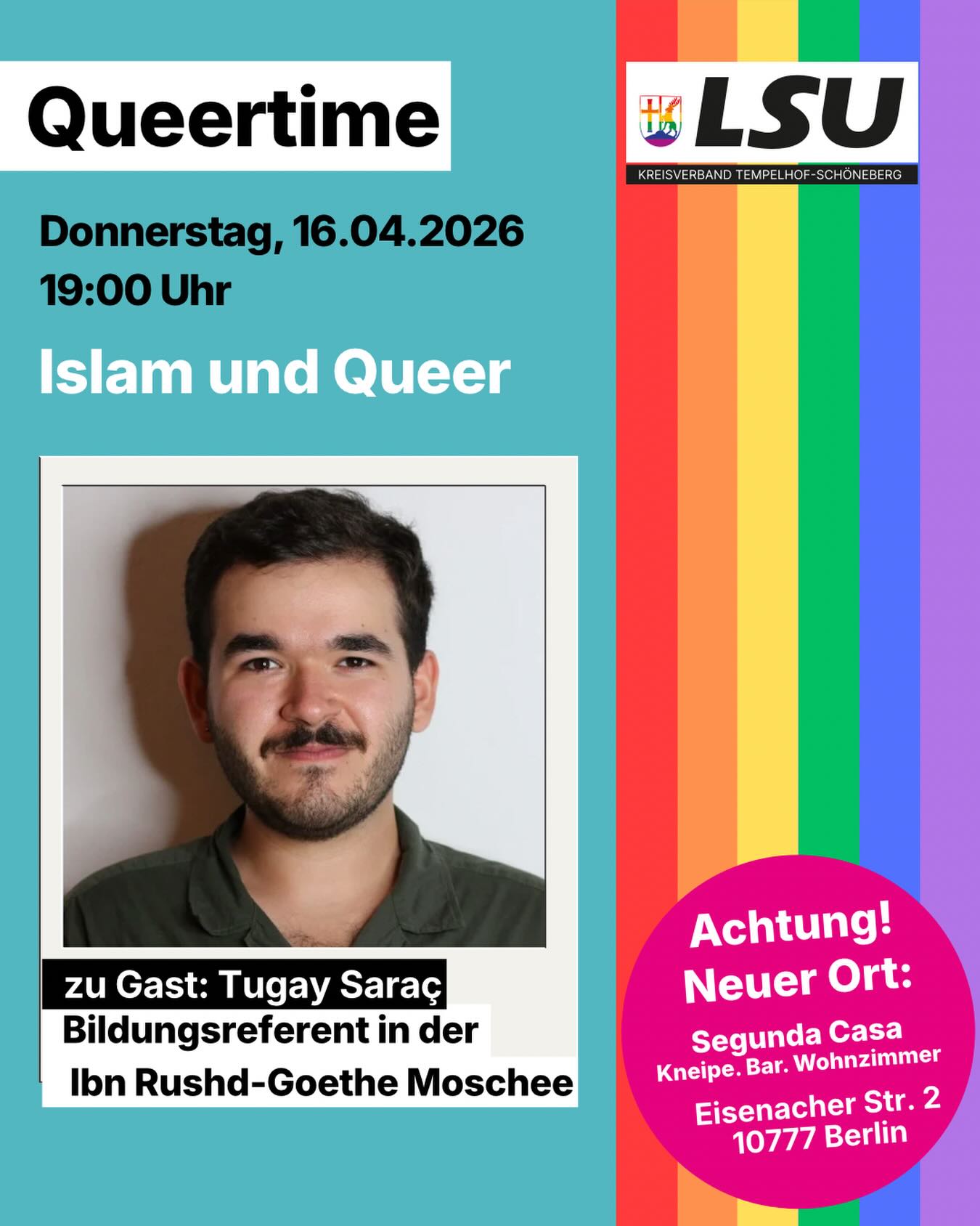 Liebe Freundinnen und Freunde, r r wir laden Euch herzlich zur nächsten Queertime - dem Stammtisch der @lsu.ts ein.r r 🗓️ Wann: am Donnerstag, den 19. März 2026 ⏰ Uhrzeit: 19:00 Uhrr 📍Wo: Segunda Casa - Kneipe. Bar. Wohnzimmer. Eisenacher Str. 2, 10777 Berlin ein. r r Im Mittelpunkt des Abends steht diesmal das Thema: r Frauen und Queer r - Welche Rolle spielen Frauen in der LGBTQI-Bewegung ? historisch und heute?r - Welche Auswirkungen hat das Recht auf geschlechtliche Selbstbestimmung auf Frauenrechte?r r Wir freuen uns, dieses Mal @katse.cdu , MdA, begrüßen zu dürfen. Sie ist Kreisvorsitzende der @frauenunion.ts und stellvertretende Vorsitzende der @cdu.fraktion.berlin im Abgeordnetenhaus. r r Eure Perspektiven, Erfahrungen und Ideen sind ausdrücklich erwünscht. Lasst uns gemeinsam diskutieren, vernetzen und konkrete Schritte für eine starke queere Kommunalpolitik entwickeln.r Wir freuen uns auf einen inspirierenden Abend mit Euch! #lsuts #lsuberlin #stammtisch #beisammensein #beerandpolitics
